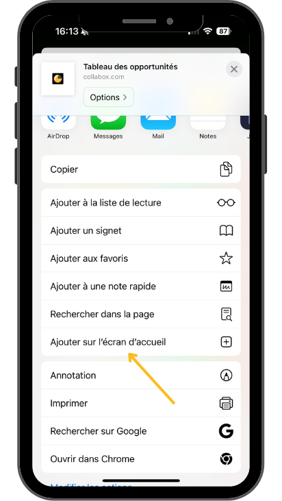 - 5- Appuyez ensuite sur « Ajouter à l’écran d’accueil », puis nommez votre raccourci (exemple: Feuille de temps). Vous verrez alors l’icône Collabox apparaître à la suite de vos applications déjà en place sur votre mobile.