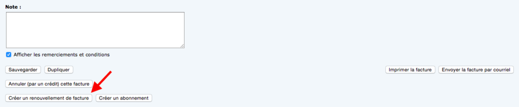 Une fois que la facture à renouveler est sélectionnée, il faut cliquer sur « Créer un renouvellement de facture ».