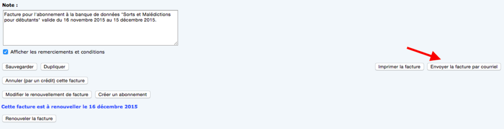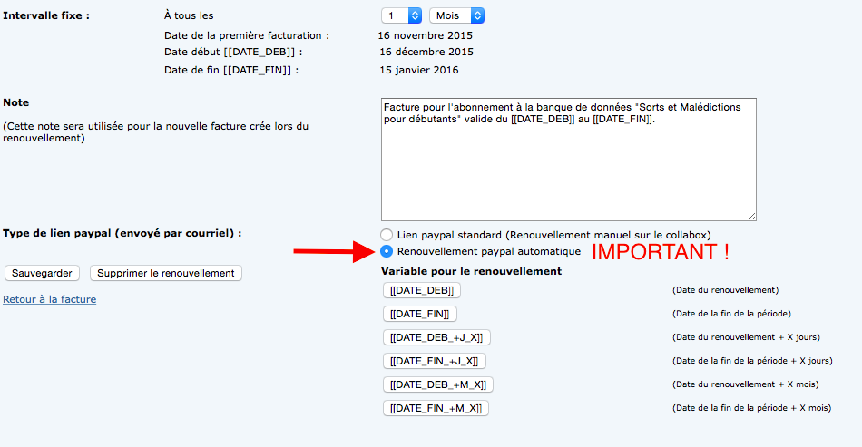 La prochaine page vous permet de fixer les paramètres du renouvellement. Ainsi, il est possible de sélectionner la fréquence de facturation. Dans le cas présent, la fréquence est réglée mensuellement. La première facture sera datée du 16 novembre et couvrira la période du 16 décembre 2015 au 15 janvier 2016. La section “Note » vous permet d’écrire un message personnalisé qui apparaîtra sur la facture de votre client. Pour vous assurer que le renouvellement est automatique auprès de PayPal, il est primordial de COCHER l’option “Renouvellement PayPal automatique”. Sinon, vous devrez renouveler manuellement la facture dans Collabox.