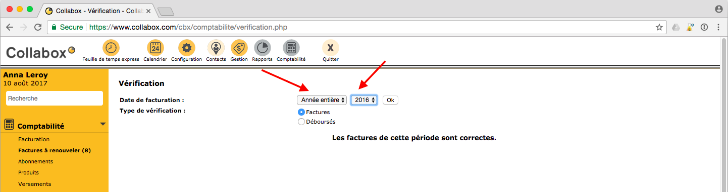 Il faut d’abord accéder au module comptabilité en cliquant sur son icône. Ensuite, cliquez sur « Vérification » dans le menu de navigation latéral. Dans le menu déroulant, choisissez « Année entière », l’année que vous voulez afficher ainsi que « Factures » ou « Déboursés ». Les deux sont à vérifier. Commencez donc par le premier. Collabox vérifie ensuite toutes les informations et vous signale où il y a des différences. Faites concorder les deux montants et le tour est joué. Pour ce qui est des déboursés, Collabox va signaler uniquement ceux avec des éléments contradictoires comme dans l’exemple ci-dessous.Comment faire une vérification ?