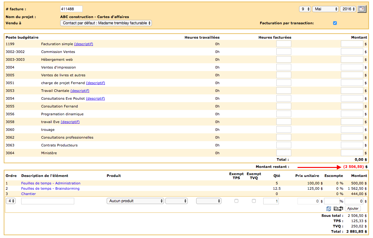 En ce qui concerne les factures, vous voyez toutes celles qui ne balancent pas. C’est-à-dire lorsque le montant de la facture envoyée au client ne correspond pas à la portion comptabilité.