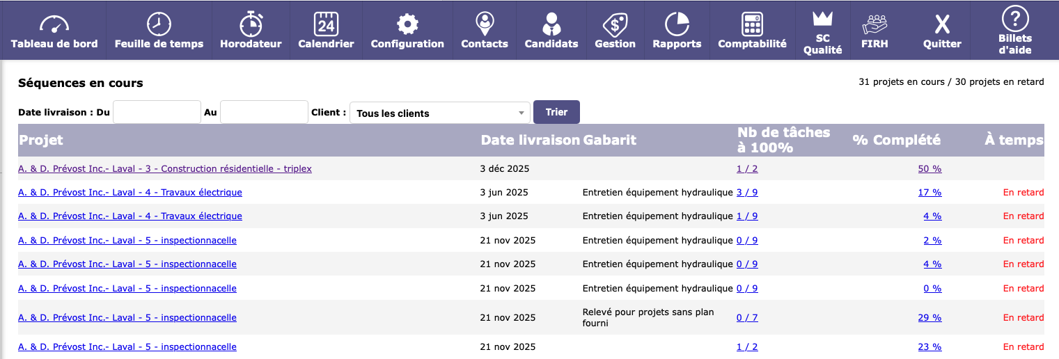 le niveau d’avancement du projet et s’il est à jour ou en retard.