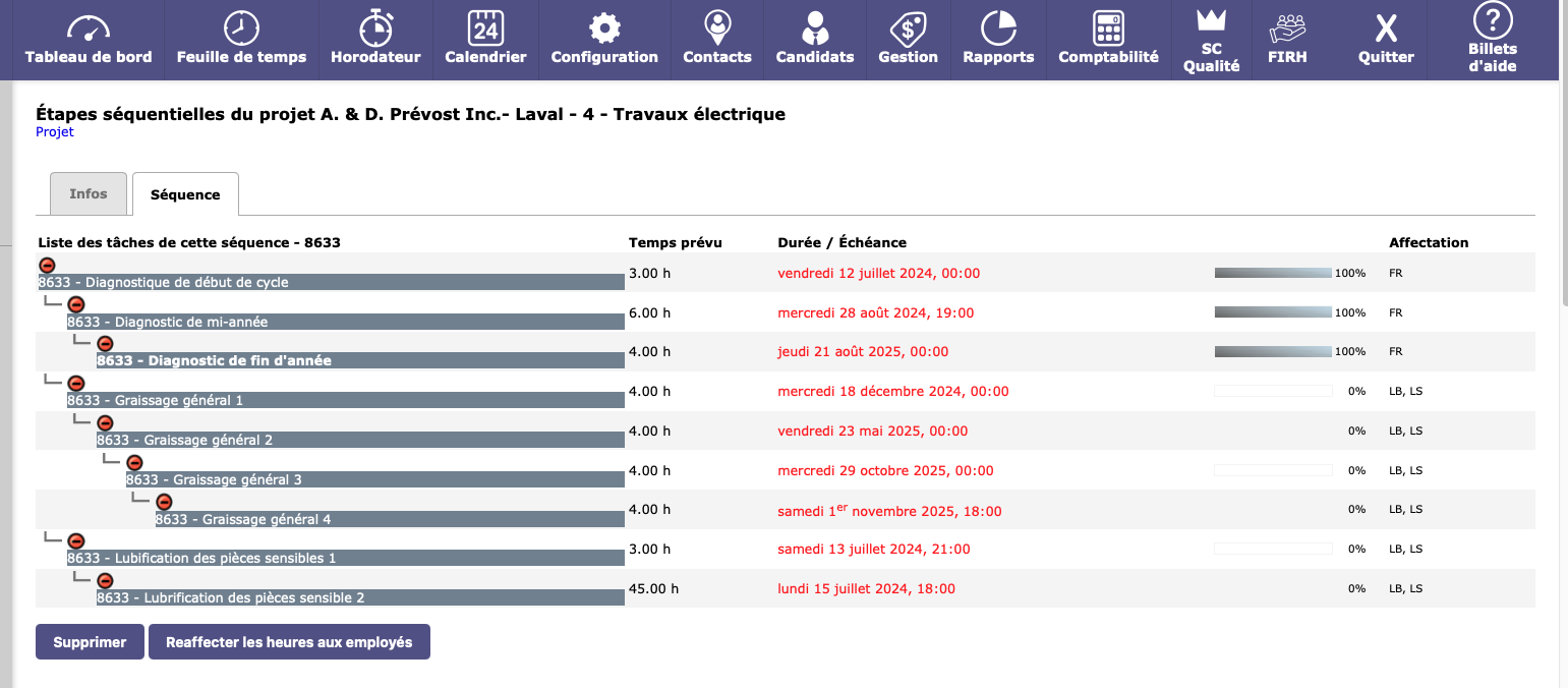 Vous pouvez maintenant consulter l’état du projet sur lequel vous avez cliqué. Il vous affiche l’échéance des différentes étapes, mais aussi quelles tâches ont été complétés ou avancées, à qui est affecté la tâche et le niveau d’avancement de celle-ci.