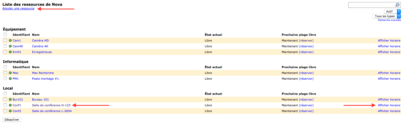 À partir de cet écran, il est aussi possible de réserver une ressource (en cliquant « Réserver ») ou bien d’afficher son horaire d’utilisation (cliquez sur « Afficher l’horaire »).