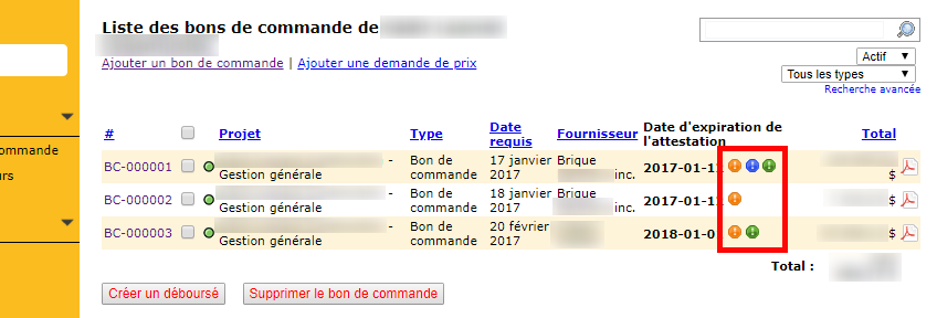 En cochant d’abord les options correspondant aux documents requis (sections 1 et 2), de petits pictogrammes apparaissent ensuite sur la page de la liste des bons de commande. Tout comme comme l’attestation de Revenu Québec, chaque document a son pictogramme visible dans la liste des bons de commande (module Gestion). Sa présence indique également que le document est nécessaire. La pastille jaune correspond à l’attestation de Revenu Québec; la bleue, à l’attestation de conformité (CCQ-CNESST); et finalement la verte, à la quittance.