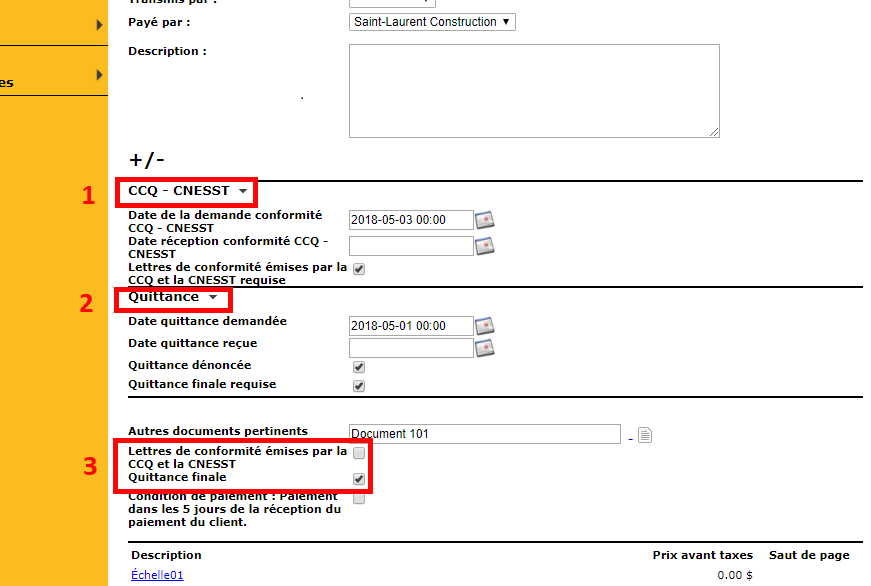 Afin de suivre de près la conformité de vos sous-traitants, il existe déjà dans Collabox un champ réservé à l’attestation de Revenu Québec dans le formulaire des fournisseurs. Nous avons voulu vous permettre d’assurer un suivi encore plus serré des gens avec qui vous traitez en ajoutant deux nouvelles sections, cette fois dans les bons de commande puisqu’elles y sont étroitement reliées : la quittance et l’attestation de conformité (CCQ-CNESST).