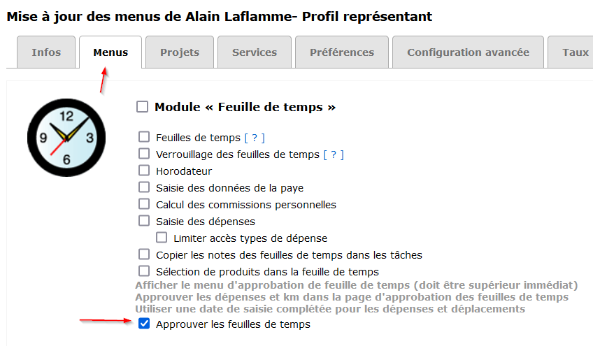 Assurez-vous d’abord d’avoir accès à l’approbation des feuilles de temps. Pour ce faire, allez dans la configuration employé et cochez la case « Approbation de feuille de temps » de l’onglet Menus.