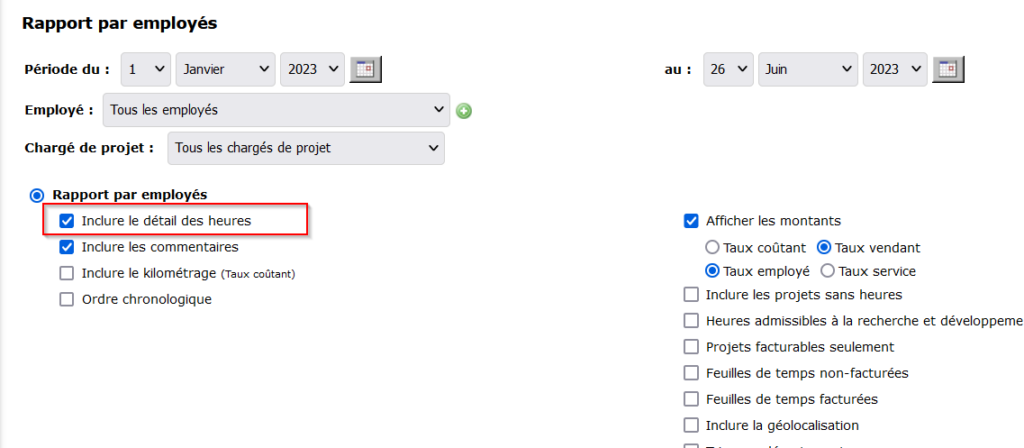 Assurez-vous de cocher la case « Inclure le détail des heures » dans les options d’affichage du rapport.