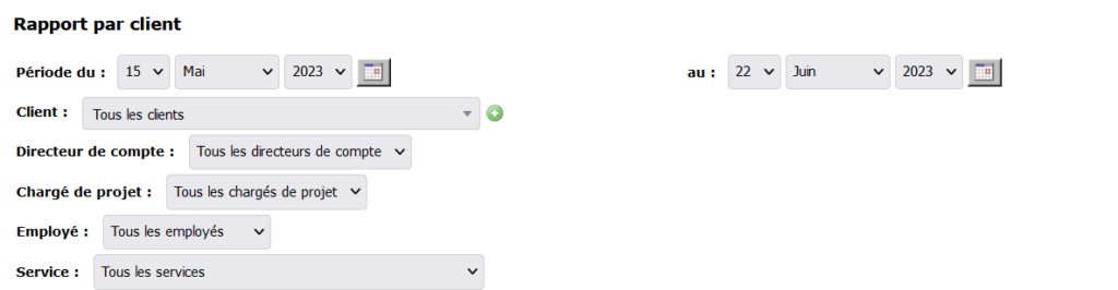Déterminez d’abord la période qui sera couverte par le rapport à l’aide des menus déroulants ou du calendrier. Puis, choisissez le client désiré en sélectionnant l’option dans le menu déroulant. Au besoin, choisissez également un directeur de compte, un chargé de projet, un employé ou un service en particulier.