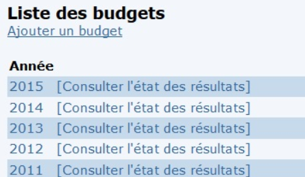 Cliquez sur l’année du budget annuel souhaité ou ajoutez-en un nouveau. Attention, le lien « Consulter l’état des résultats » mènera plutôt à vos données en temps réel.