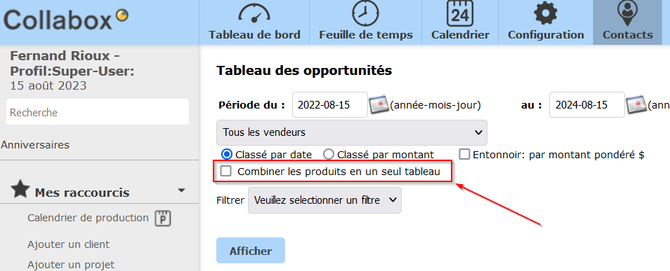 Pour utiliser les objectifs de vente adéquatement, ouvrez votre tableau des opportunités. Assurez-vous que la case « Combiner les produits en un seul tableau » est décochée.