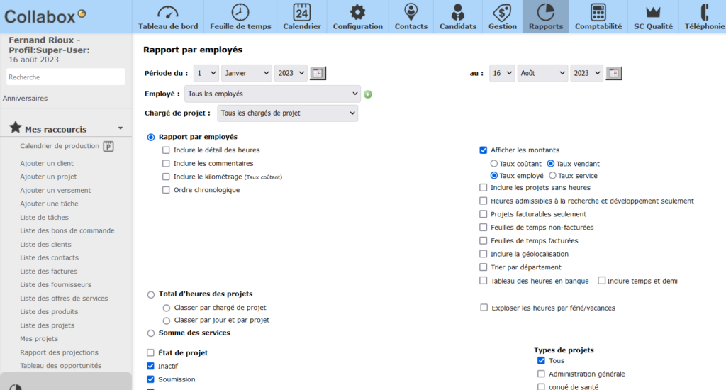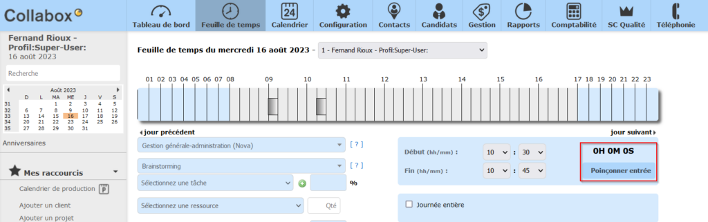 Collabox possède une minuterie parmi les différentes options de feuilles de temps. Cette derni;ere permet aux employés de l’entreprise de saisir leur temps sous forme de « poinçon ». Facile d’utilisation, elle fonctionne avec les projets et les services tout comme la feuille de temps normale.