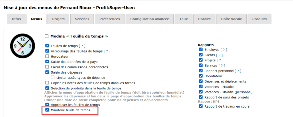 D’abord, assurez-vous d’avoir donné accès à la minuterie à votre employé. Allez dans l’onglet « Menus » de la fiche employée et cochez « Minuterie dans la feuille de temps ».
