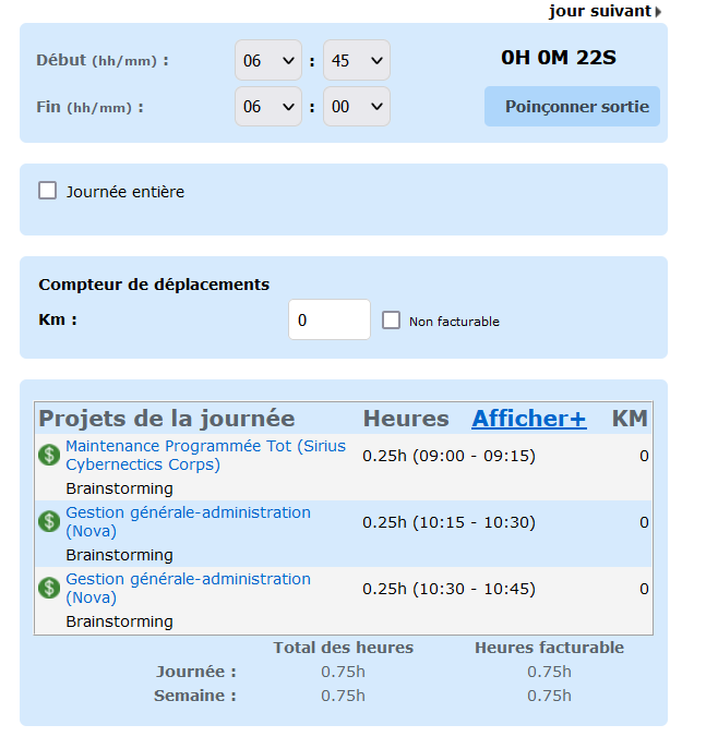 Puis, dirigez-vous dans la feuille de temps de l’employé désiré, ou la vôtre le cas échéant. Vous verrez qu’un compteur et un bouton « poinçon » ont été ajouté à droite de la feuille de temps.