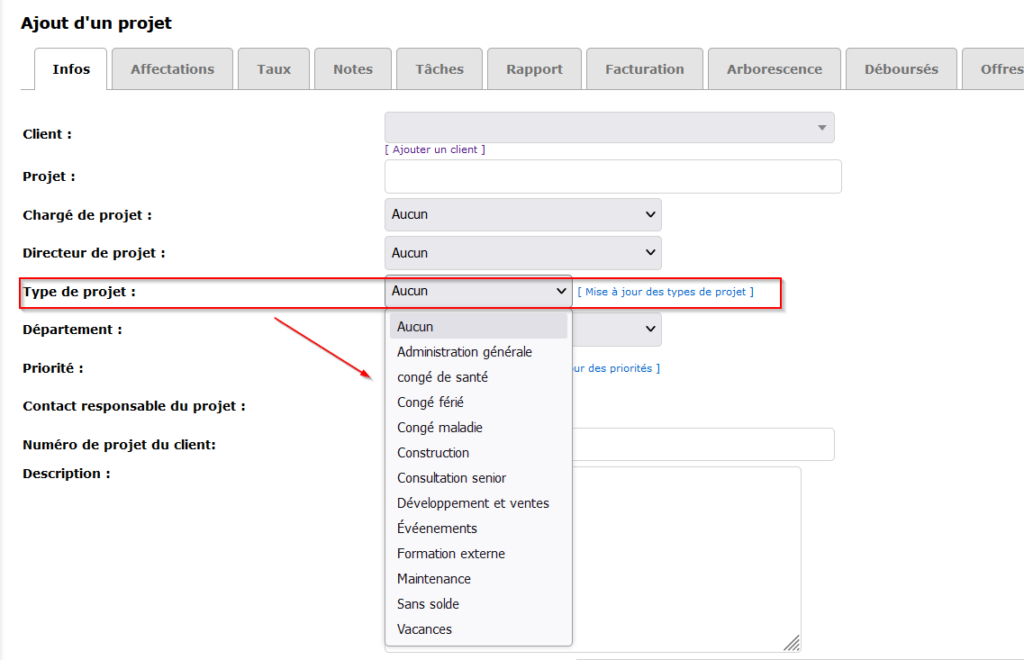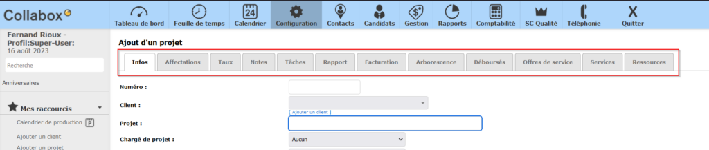 Lors de la création d’un projet, le premier onglet « Infos » est très important à remplir. En effet, c’est là que vous entrez le nom du client, le titre du projet et le chargé de projet, entre autres.