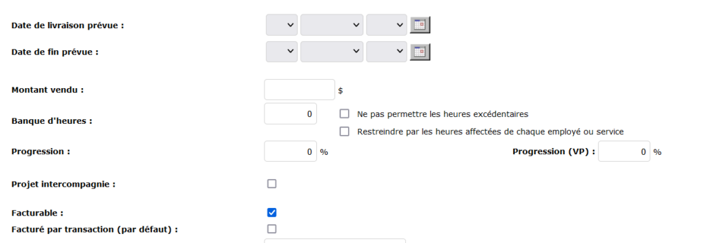 De plus, ajoutez toutes les autres informations que vous jugez nécessaires. Il y a la date de livraison prévue, le montant vendu (souvent en lien avec une offre de service), la banque d’heures prévue, le cas échéant, ainsi que le type de facturation. Un projet peut être non facturable, facturable ou facturable par transaction (temps et matériaux).