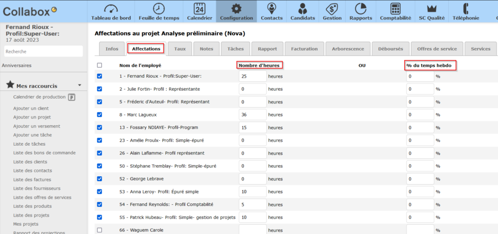 Cliquez maintenant sur le 2e onglet « Affectation ». C’est ici que vous pouvez affecter des employés au projet en cochant leur nom. Au besoin, inscrivez un nombre d’heures prévues pour chacun d’eux, ou un pourcentage de leur horaire hebdomadaire.