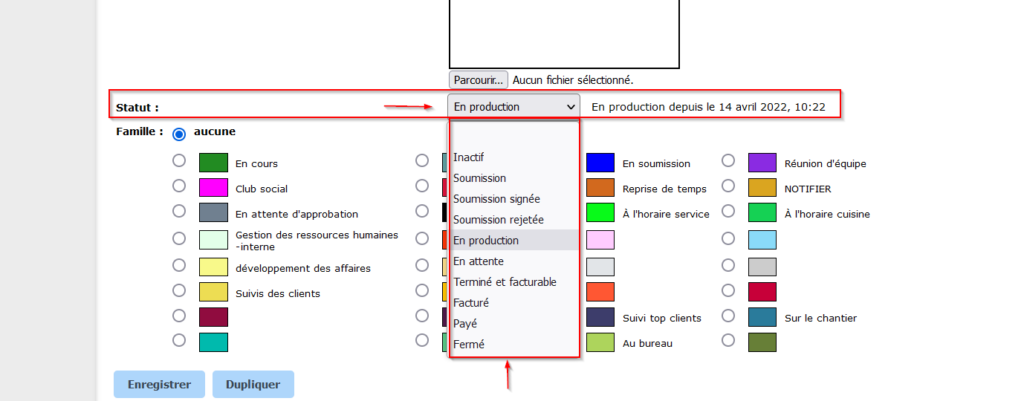 Avant de sauvegarder votre projet, assurez-vous de lui donner un statut. Est-ce qu’il s’agit d’un projet en soumission? En production? Fermé? Inactif? Le statut du projet est important pour vos rapports, car la plupart sont générées uniquement lorsqu’il est en mode « production ». Changez le statut du projet au bas de la page par le menu déroulant.