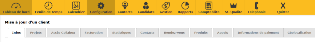 En ouvrant une fiche à partir de la Liste des clients, vous verrez plusieurs onglets qui contiennent toute l’information du client.