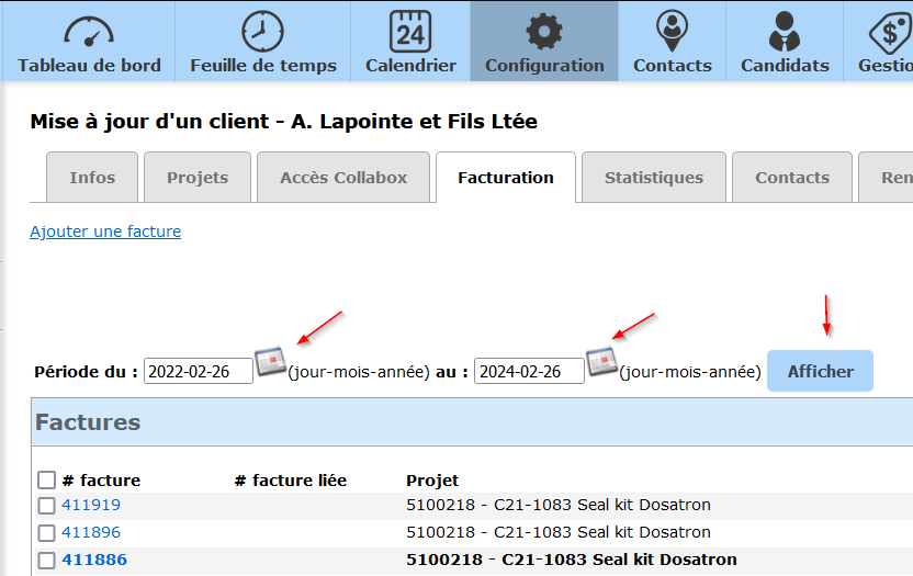 D’abord, sachez que cet onglet contient l’historique complet de la facturation de votre client. Assurez-vous de bien choisir votre intervalle de recherche avant de procéder.