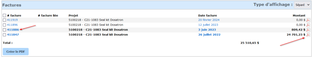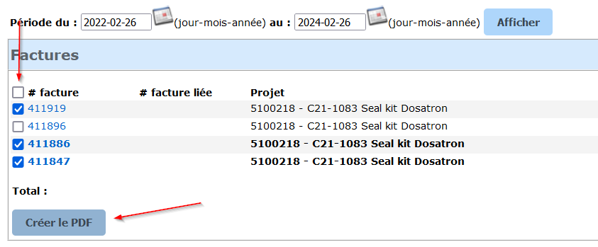 Finalement, si vous devez produire un PDF contenant plusieurs factures, il vous suffit de cocher celles qui vous intéressent, puis de cliquer sur le bouton « Créer le PDF ».