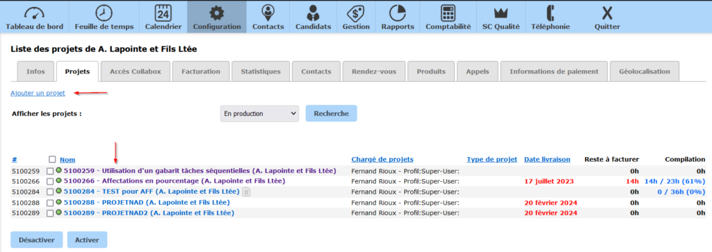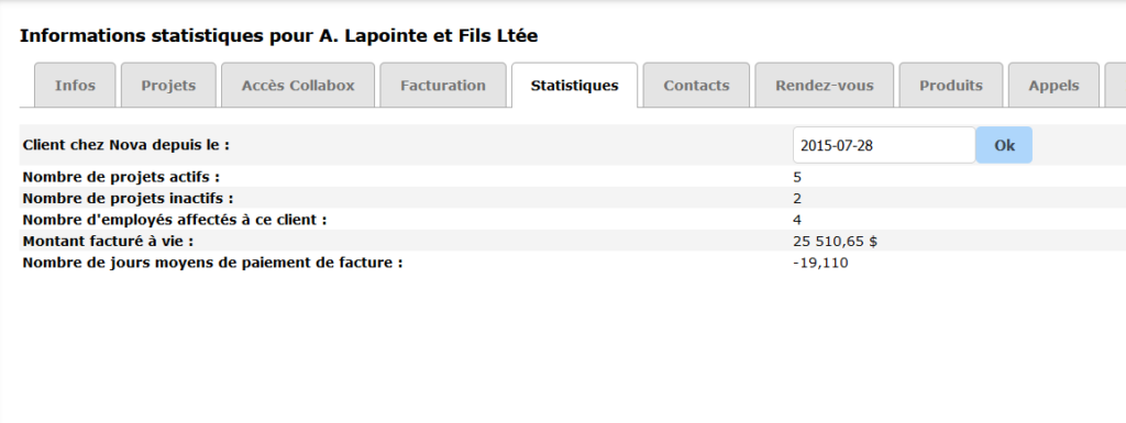 L’onglet suivant, Statistiques, dresse un portrait global de votre historique client. Il affiche le nombre de projets, les employés affectés et le montant total vendu.