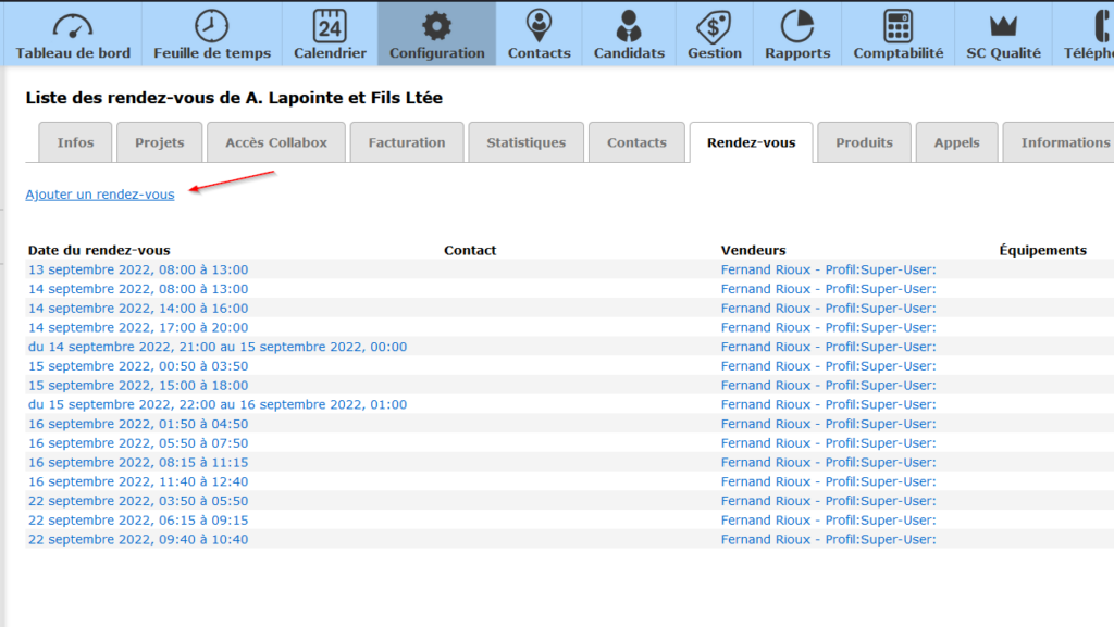 Votre CRM permet d’ajouter plusieurs contacts à un même client. Ils se trouvent tous ici, dans l’onglet Contacts. De même, tous les rendez-vous passés et à venir avec votre client sont affichés dans l’onglet du même nom. Bien entendu, vous pouvez en ajouter un nouveau au passage !