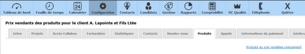 Il arrive parfois que pour une raison ou une autre, qu’un client pour qui vous vendez des produits possède un prix forfaitaire ou différent des autres. L’onglet Produits sert à documenter ces montants et les garde en mémoire pour la facturation.