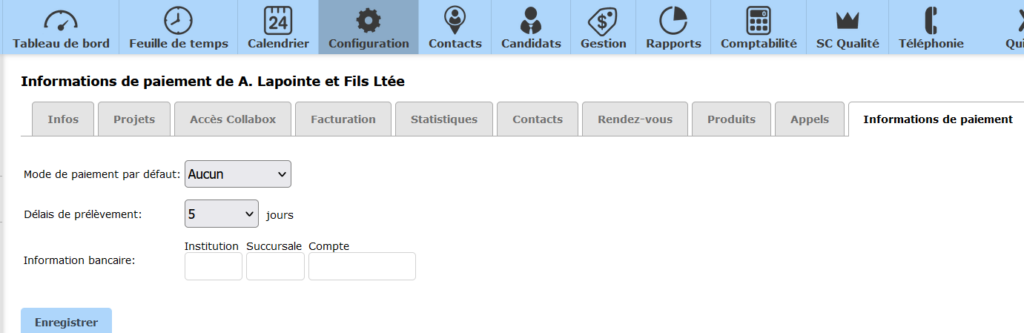 Certaines entreprises ont des ententes de PPA avec leurs clients. Les « Informations de paiement » doivent ainsi être gardés en mémoire pour que Collabox puissent générer les bons documents pour votre institution bancaire. C’est donc à cet endroit qu’il vous faut remplir les champs obligatoires.