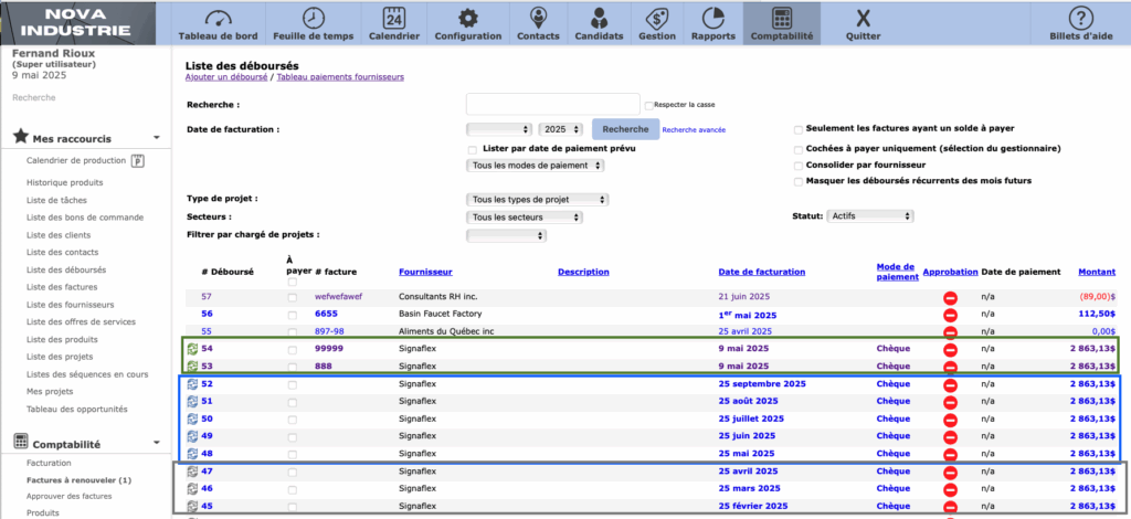 L’icône indiquant les déboursés récurrents est maintenant affiché en couleur selon la date de la facture : Gris= déboursés passés, Vert = déboursés en date d’aujourd’hui, Bleu = déboursés futurs.