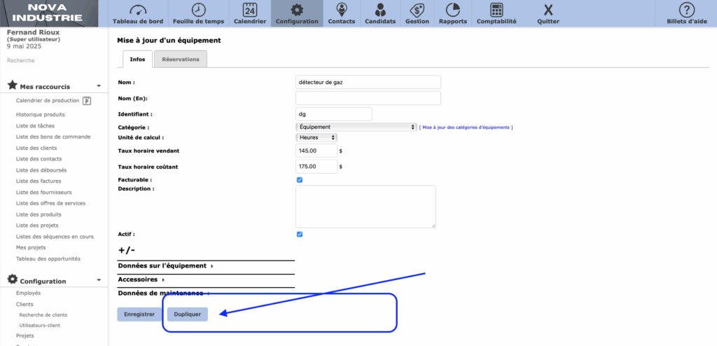 Il y a maintenant un bouton « Dupliquer » dans la fiche Équipement. Il permet de dupliquer une fiche équipement et de faire des modifications particulières. Un nom, une catégorie, des taux, mode facturable ou non, etc.