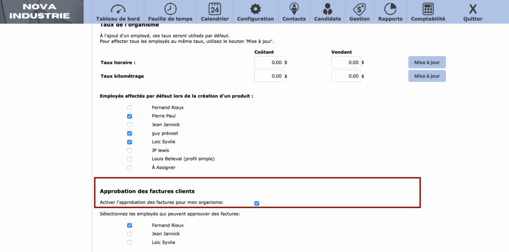 Fonctionnalité qui détermine si les factures sont créées directement en mode « Approuvée » ou en mode « À approuver ». C’est une préférence « Organisme » accessible normalement seulement aux super-utilisateurs de votre entreprise.