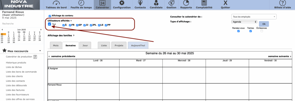 Ajout d’une case à cocher « tout » afin de pouvoir cocher ou décocher l’affichage des agendas de tous les utilisateurs d’un coup.