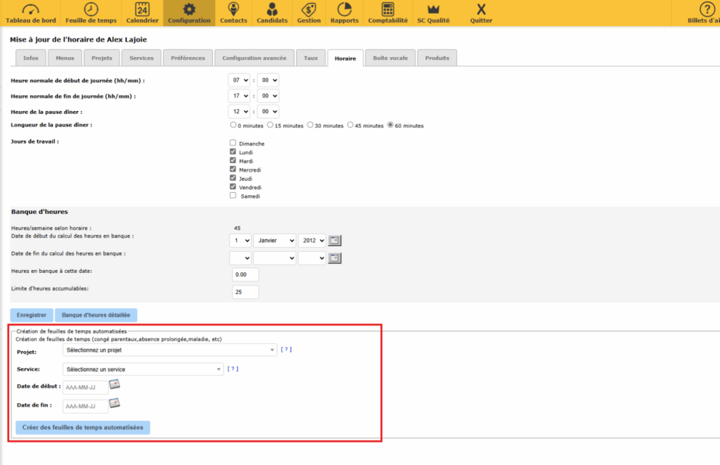 Il est possible de configurer l’automatisation des feuilles de temps pour les absences prolongées dans une année, comme par exemple, tous les congés fériés, des absences prolongées de type congés parentaux ou autres.