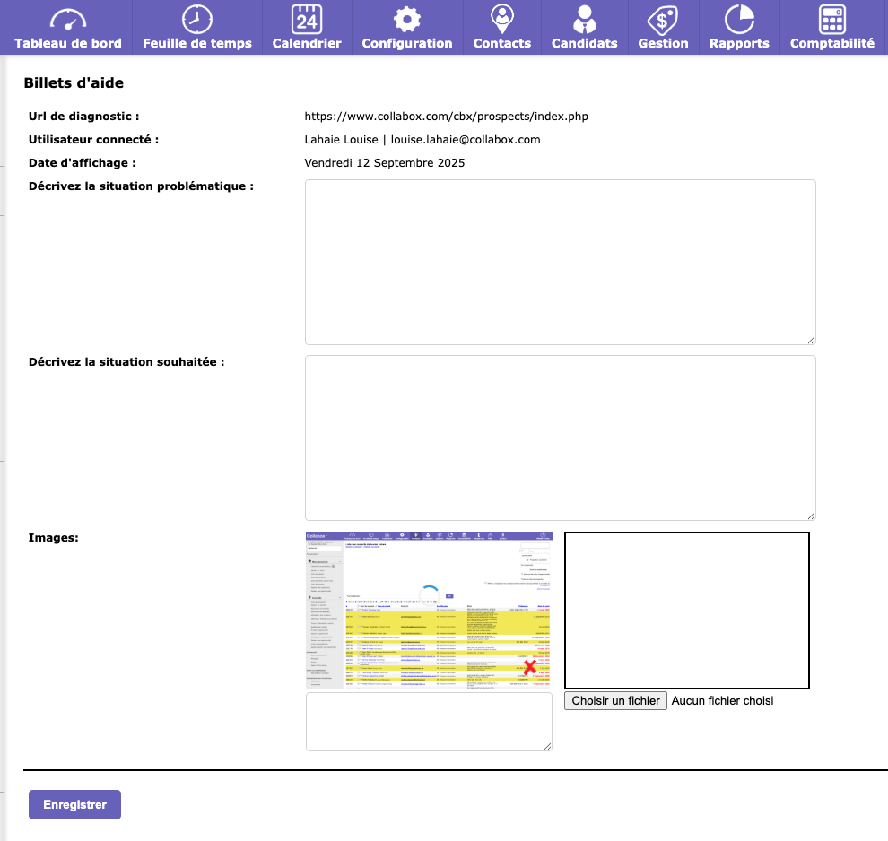 Le Billet d’aide permet d’envoyer une question au super-utilisateur désigné pour qu’il puisse aider son collègue. Le Super-utilisateur reçoit un courriel avec le lien de la page qui requière une intervention de sa part. À ce moment, Collabox ne reçoit pas les billets d’aide des employés.
