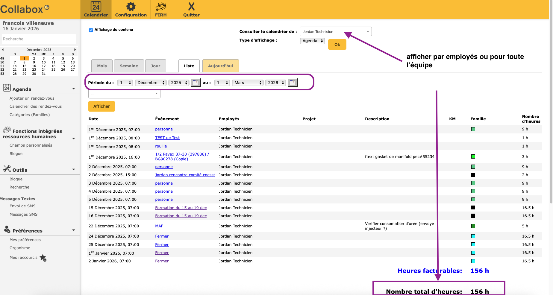 Par exemple ici: Jonathan a 156 heures à son agenda du 1 décembre 2025 au 1 mars 2026