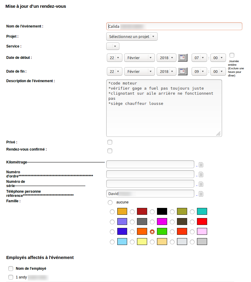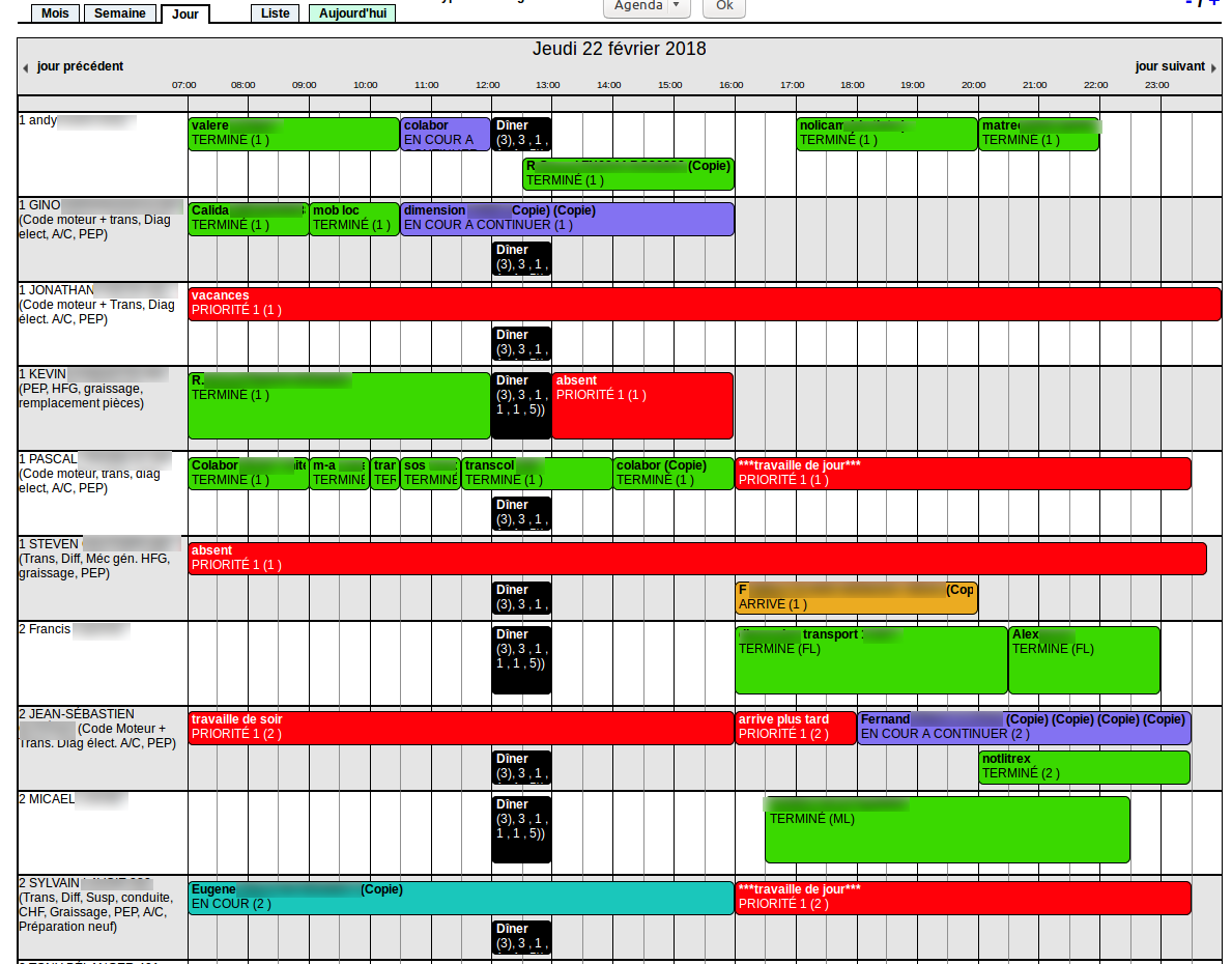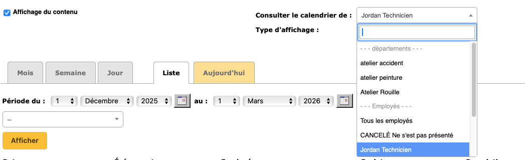 Par exemple ici: on a trois département: un atelier accident, un atelier peinture en plus d’atelier rouille. Si vous en sélectionnez un, les employés attitrés à ce départements s’afficheront dans la liste avec les heures prévues.