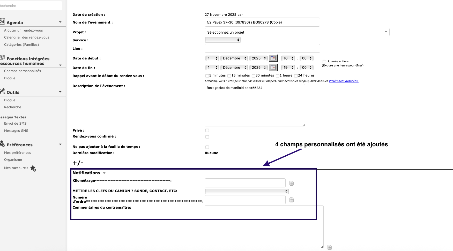 Voici des exemples de champs qui ont été ajoutés dans les rendez-vous