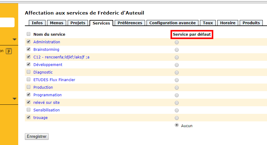 Then click on the name of the employee whose department you want to set as default. Go to the Services tab and select the desired default service. Don’t forget to click on Record !