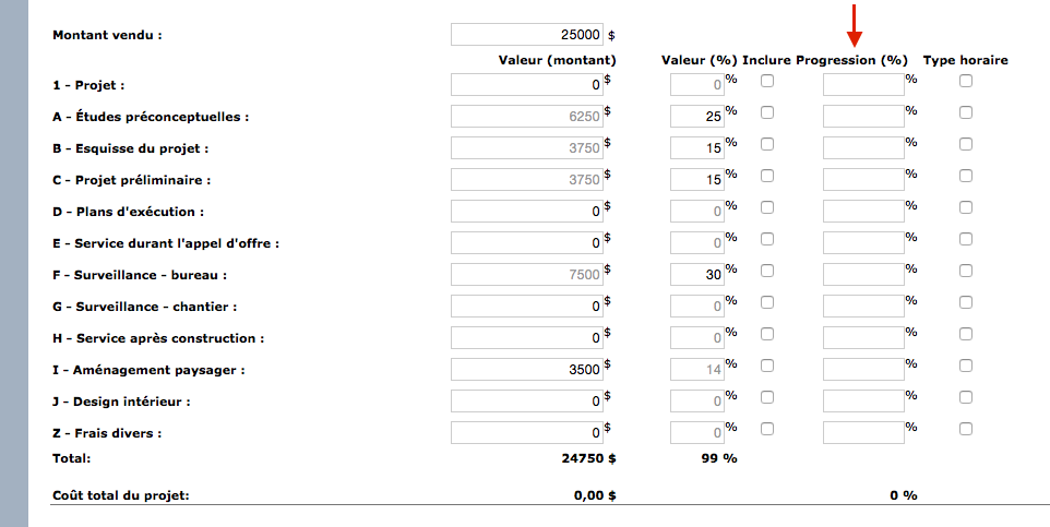Column 1: This column is used to enter the level of progress (unlike the level of “progress”, the level of progress is a level of achievement of the work that is communicated to the client. The latter may be different from the level of progression for reasons of business strategy, sales or management. Still a sensitive issue, the level of progress determines the portion of work to be invoiced on the project.
