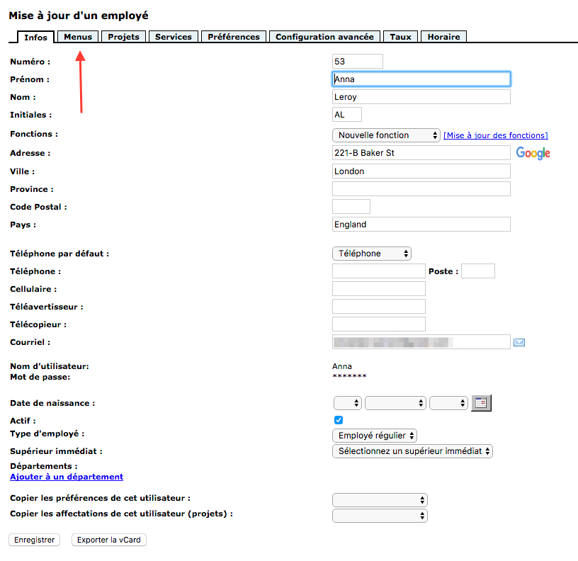 5- Select your name or that of the employee wishing to have access to the resource reservation schedule. Then click on the “Menus” tab.