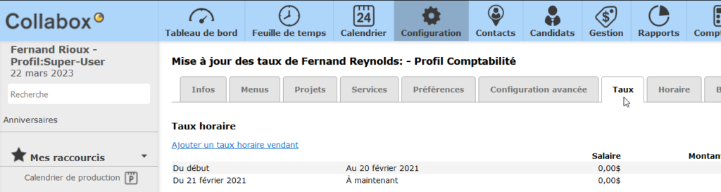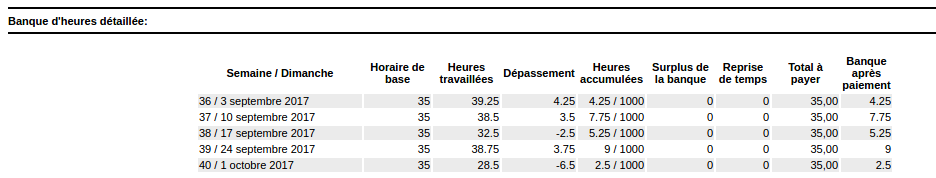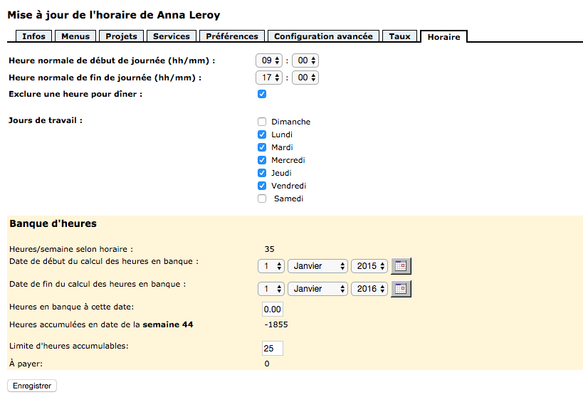 Don’t forget to configure the time bank if you want to calculate the overtime due to your employees. You must first enter the start date for calculating the bank of hours (generally associated with the start of the employee’s hiring) or the number of hours accumulated to the selected date (if you don’t use the hiring date). If you wish to limit the number of hours you can accumulate, indicate this in the space provided. Don’t forget to save your changes. You must complete these steps for each of your employees.