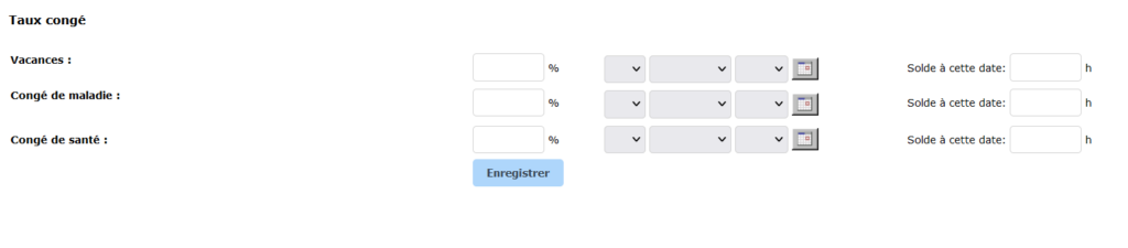 Scroll down to the “Holiday rates” section. There are three sections to complete: vacation, sick leave and health leave. You must manually enter the percentage of hours accrued for these three banks, according to current standards or your internal policy.