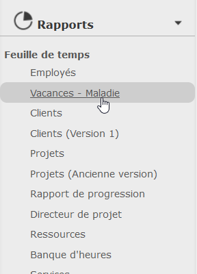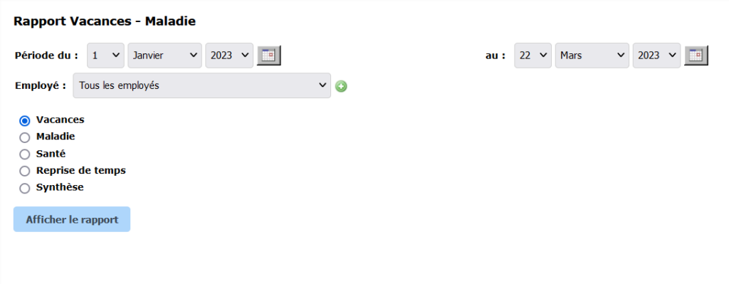 For Vacation – Illness reports, select the desired report from the list, as well as the correct time interval and employee.