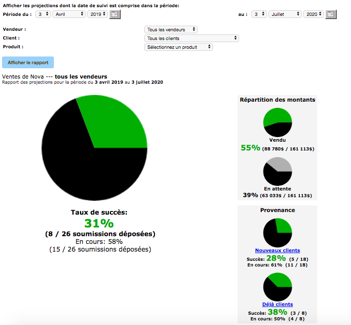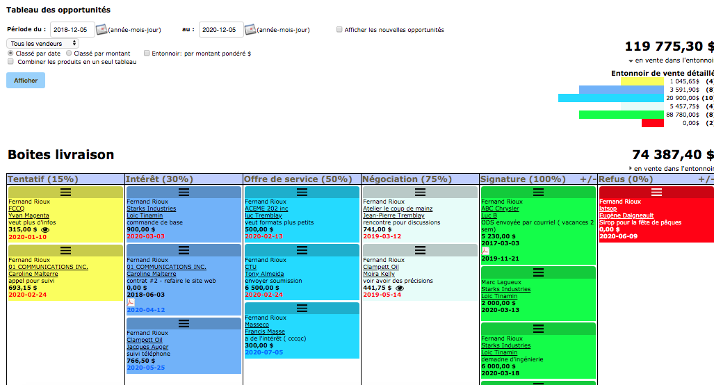 You will see this table appear, offering you an overview of the progress of the files. You will see all of your customers based on their opportunity statuses. The table is sorted by date or by amount, depending on the option you choose. Each column corresponds to a status. It includes customers who share this same status, as well as a total of the weighted sums in the last row of the table.