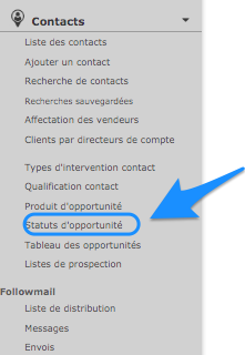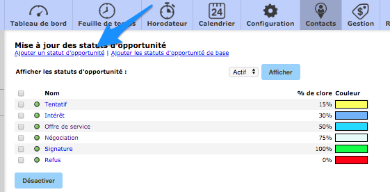 To create your own statutes, click on the menu Add an opportunity status. This will create your first status, or a new one, if applicable.