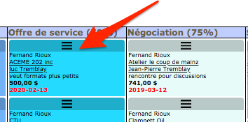 To change the opportunity status of a customer, select the check box corresponding to the customer using your mouse. Hold down the left click while dragging the box to below the new status, then drop it to its new location. The new status will be saved in the table and in the customer file, and the color of the rectangle will automatically change.