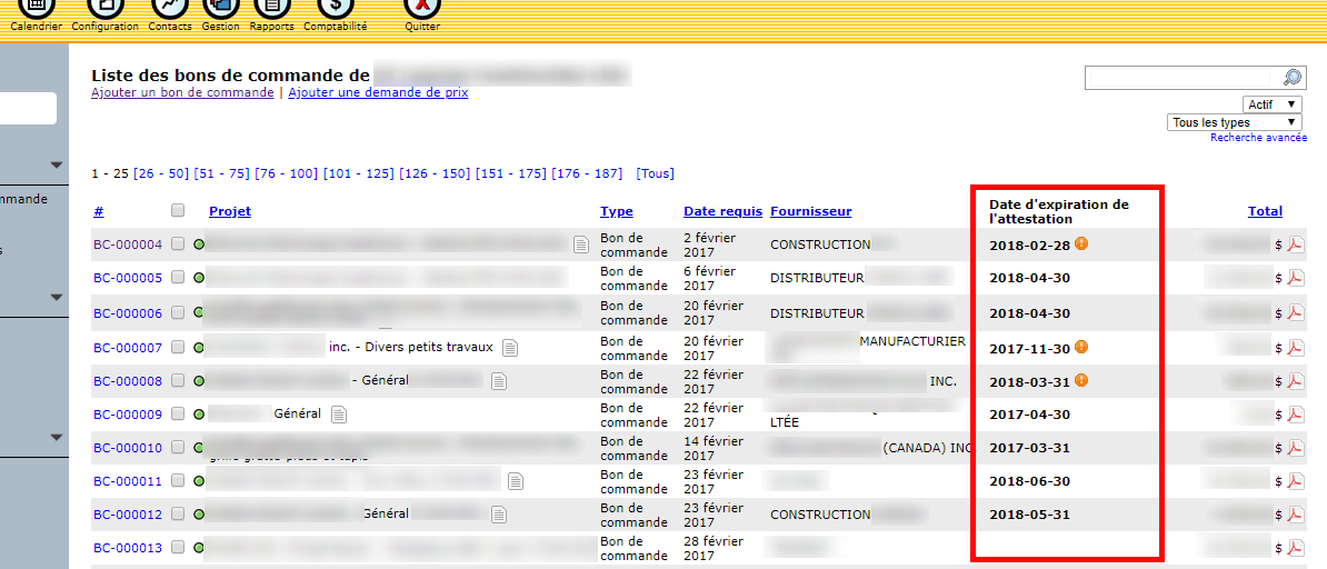 Finally, the yellow dots to the right of the expiration dates tell you that the supplier exceeds $ 25,000 and that a certificate is required.