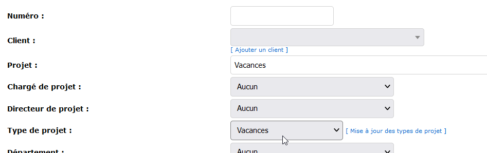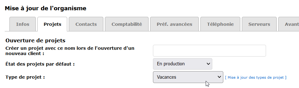 You must then update the project types by clicking on the link of the same name. This page shows you all the types of projects in your organization. Make sure you find a “Holiday” type...
