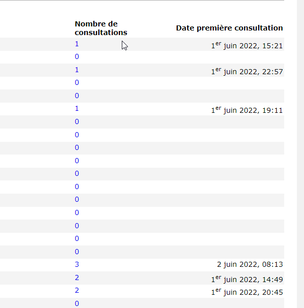 A list of all the contacts who have received the message is displayed, with a column entitled “Number of consultations” and another entitled “Date of first consultation”. So you see who opened and read your message!